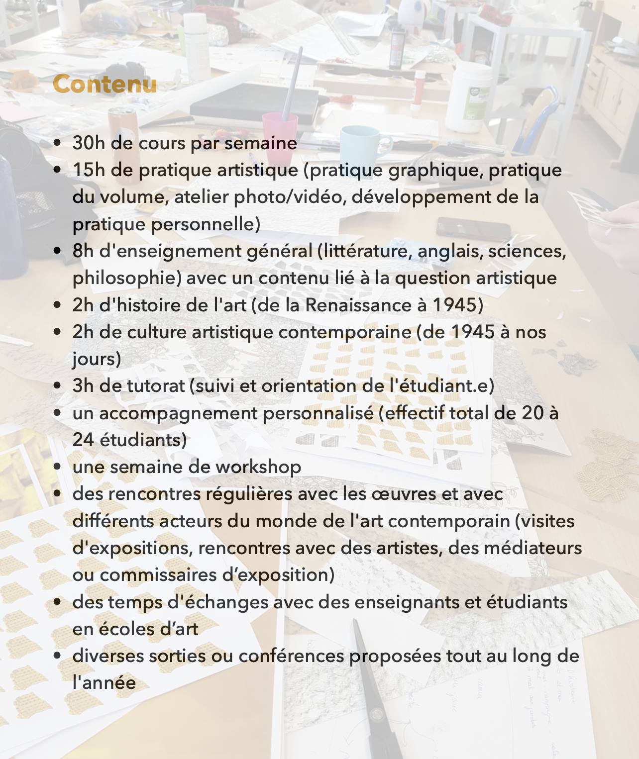 Les cours se déroulent pendant une année scolaire et articulent des phases de consolidation et d’approfondissement dans les domaines pratiques, techniques et théoriques. Le cursus est pluridisciplinaire, approfondi et en phase avec les exigences des écoles supérieures d’art. Divers partenariats viennent en appui de la formation.