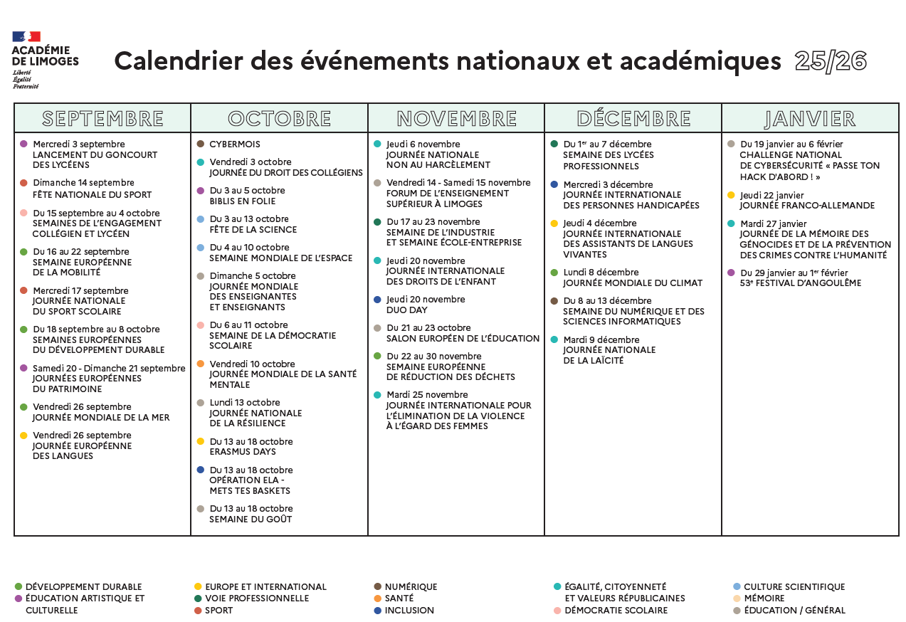 Calendrier des événements nationaux et académiques 25-26
