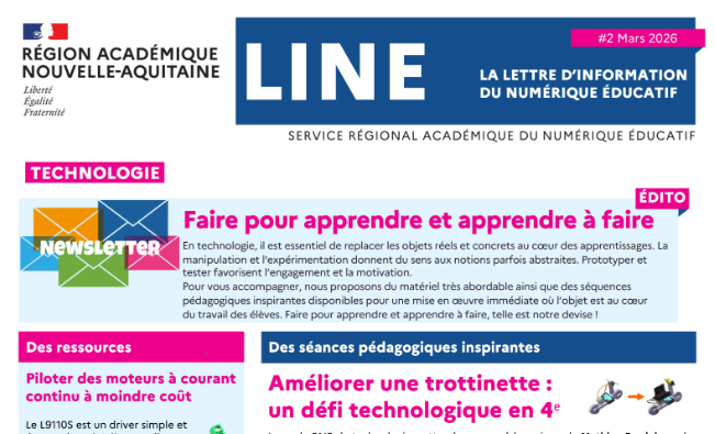 Pour cette lettre de mars 2026, l'éclairage se porte sur deux séquences inspirantes des académies d'Orléans-Tours (comment améliorer une trottinette ?) et Toulouse (Comment sécuriser les casiers du collège grâce à l'IA ?). Deux matériels à faible coût sont également mis en avant : une imprimante 3D et un driver moteur à 1 €.