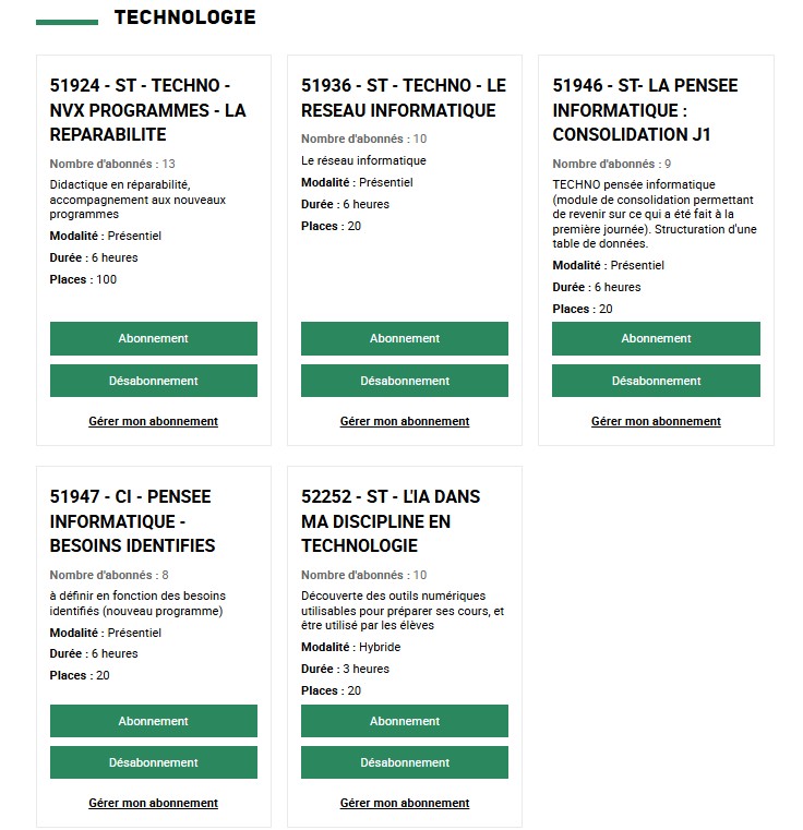 5 formations académiques sont proposées cette année + les Fabriques départementales. Les inscriptions s'effectuent en 3 phases : 1- l'abonnement (pour manifester l'intérêt que vous avez pour la formation) 2- la préinscription (si la formation est retenue, vous recevez un message pour confirmer votre intérêt pour la formation) 3- la convocation